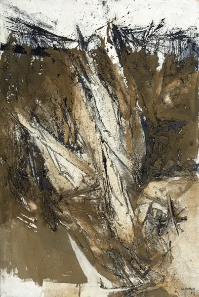 In those years, in a moment of social conformity and conservatism in Spain, Canogar created a gestural language of abstract painting which was provocative and radically new. The exhibited works illustrate this dynamic sense of energy and freedom that inhabited the artists from El Paso, and that Canogar expresses through a visceral and fierce brushstroke. The oil painting is intervened by the artist’s own hands, tracing furrows with his fingers, reminiscent of the peasant who leaves his imprints with his plough on the Castilian lands, land of the painter.