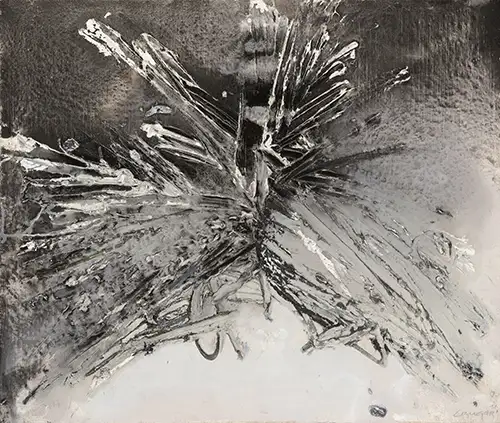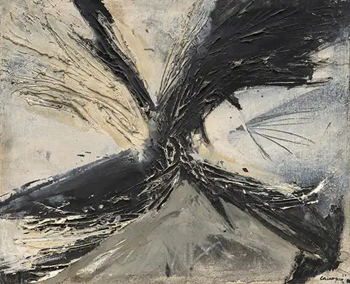 En esos años, en un momento de conformidad social y conservadurismo en España, Canogar creó un lenguaje gestual de pintura abstracta provocativo y radicalmente nuevo. Las obras expuestas ilustran este sentido dinámico de energía y libertad individual que tuvieron los artistas de El Paso, que Canogar expresa a través de una pincelada visceral y feroz. La pintura al óleo es intervenida por las propias manos del artista, mediante el trazado de surcos con los dedos, evocando al campesino que con el arado deja sus huellas en las tierras castellanas, tierra del pintor.